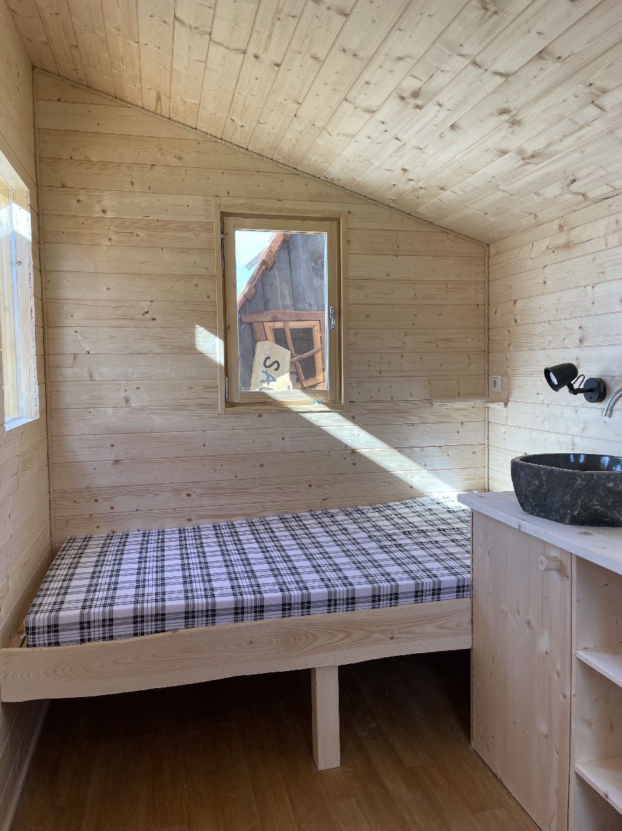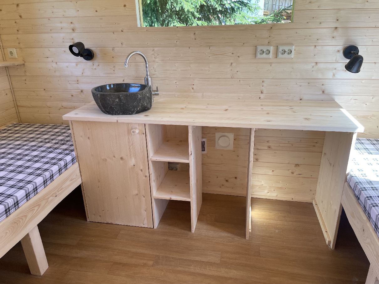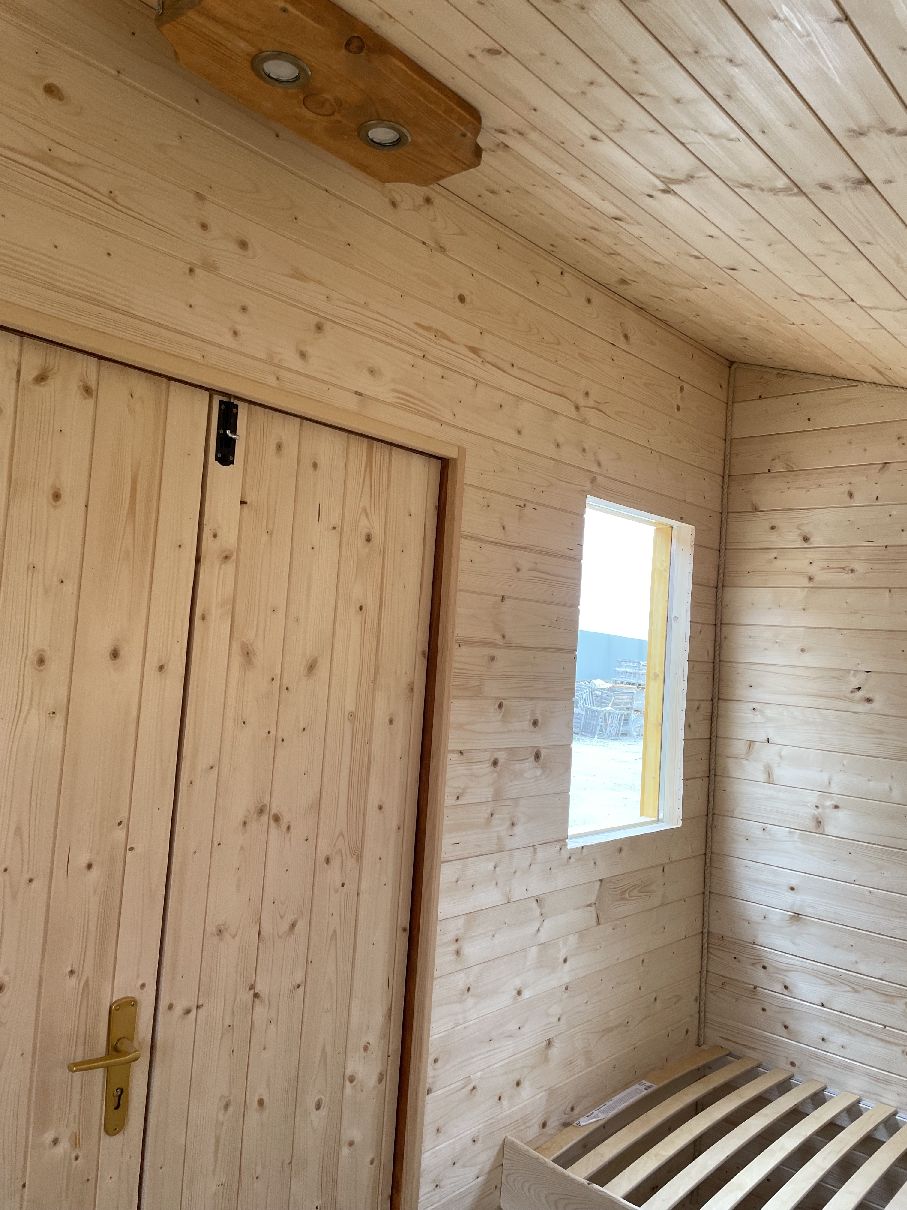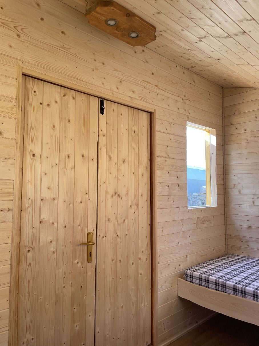 De hut heeft 2 bedden van 200 x 90 cm, ledverlichting, stopcontacten en een elektrische convector van 500 watt. Er is een doorstroomverwarmer en een spoelbak. Voorbereiding voor de installatie van airconditioning is aanwezig. Kan ook casco geleverd worden.