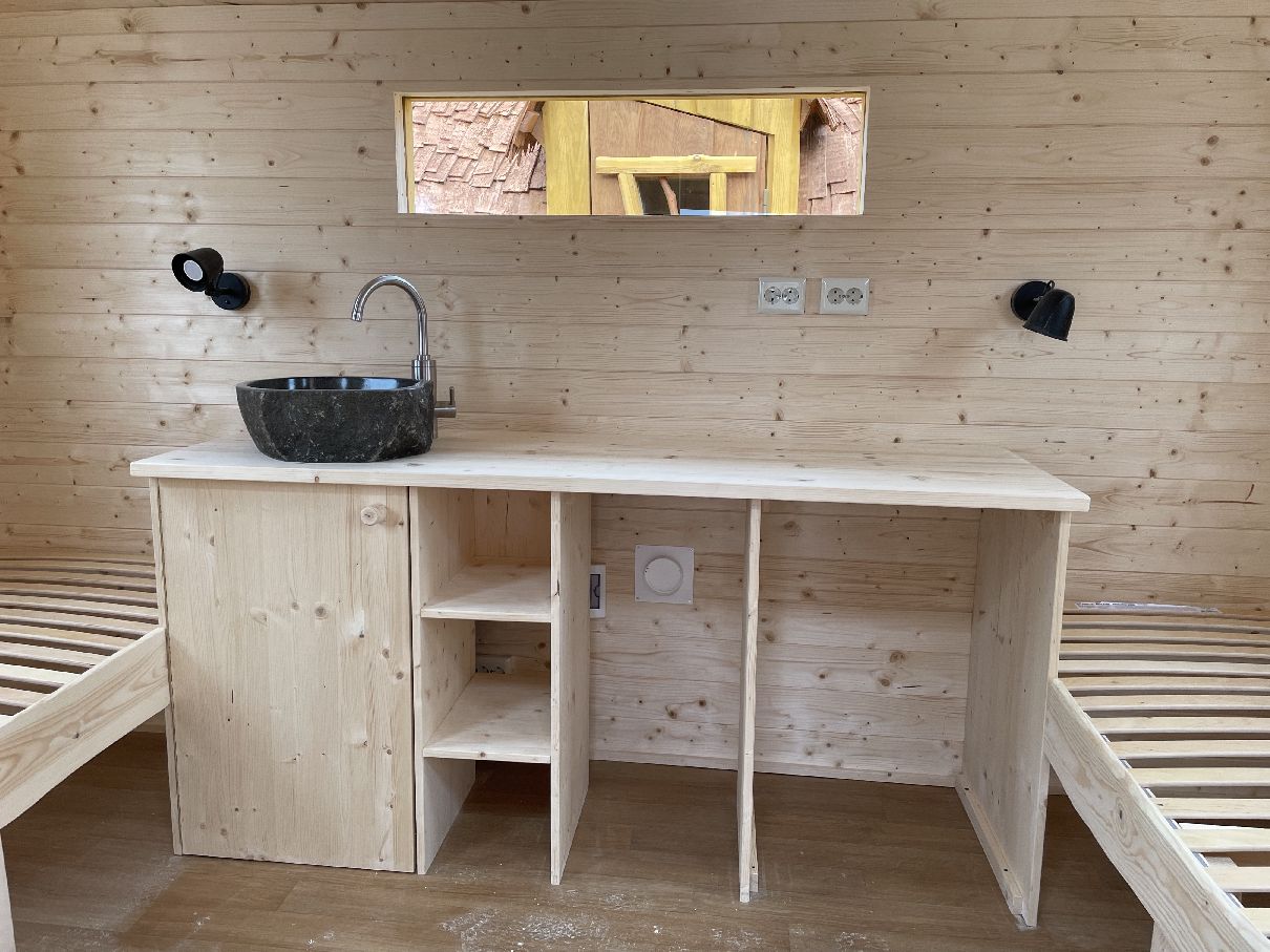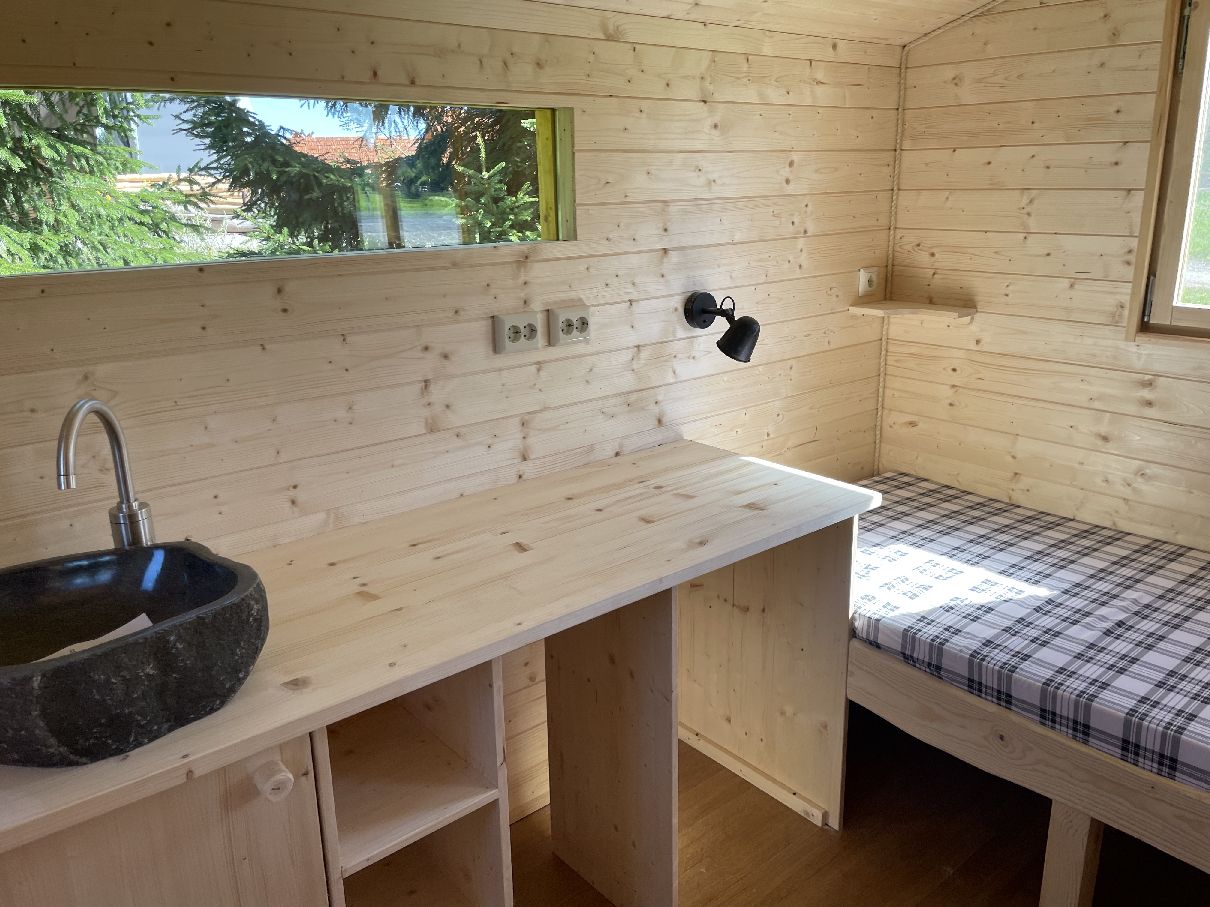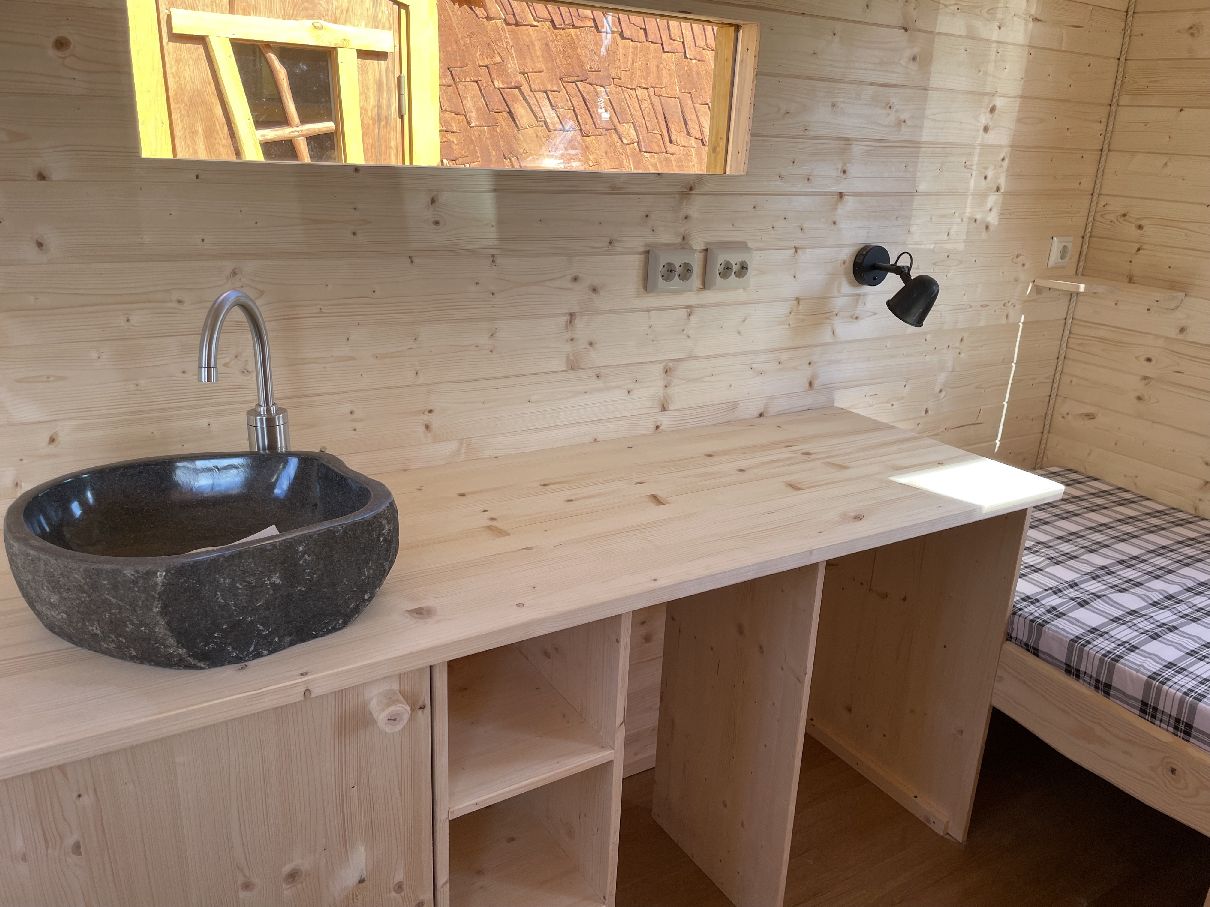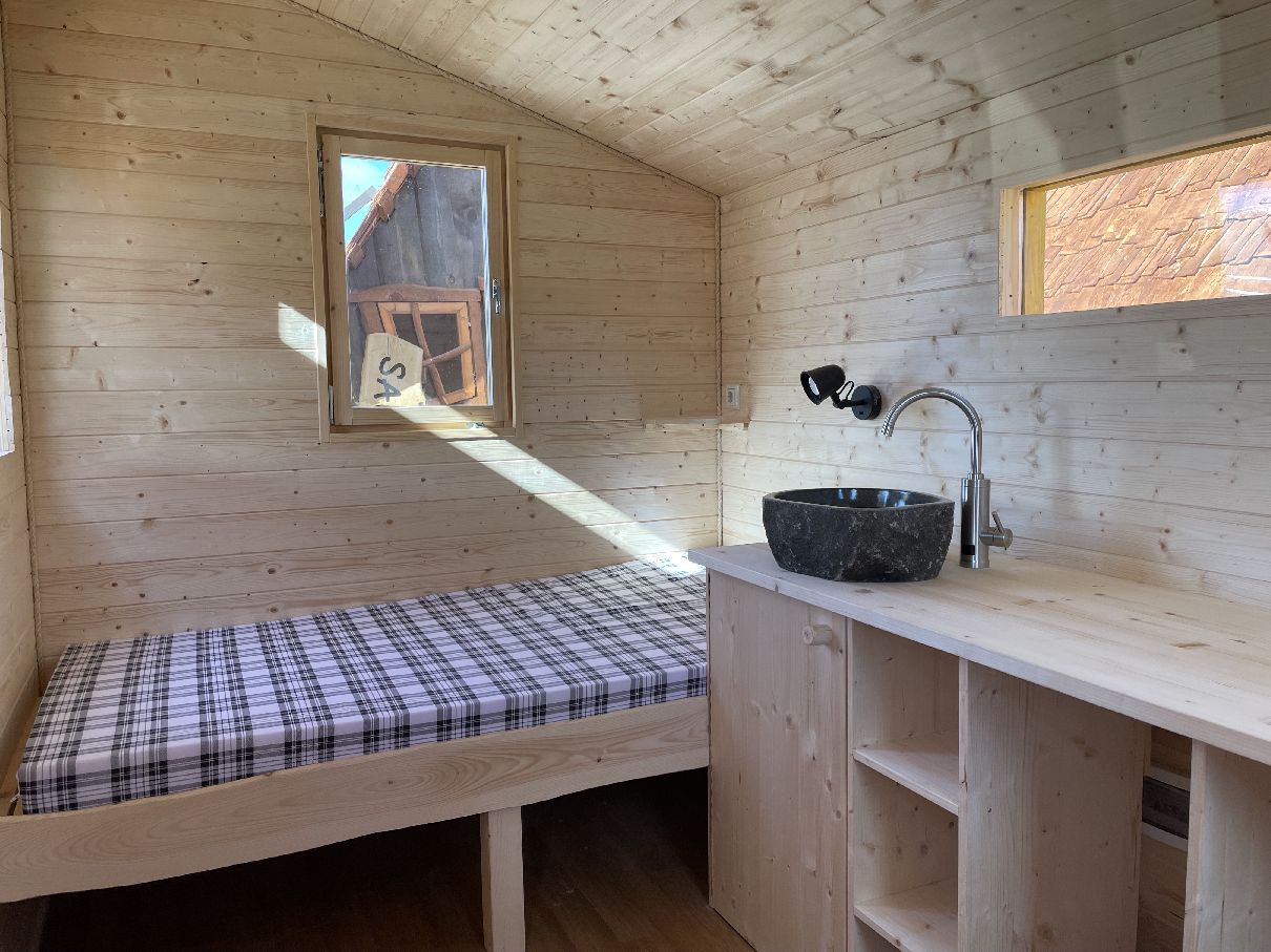 De hut heeft 2 bedden van 200 x 90 cm, ledverlichting, stopcontacten en een elektrische convector van 500 watt. Er is een doorstroomverwarmer en een spoelbak. Voorbereiding voor de installatie van airconditioning is aanwezig. Kan ook casco geleverd worden.